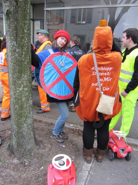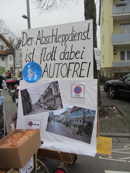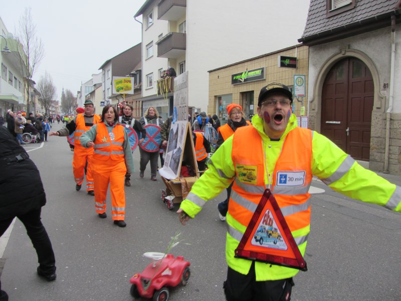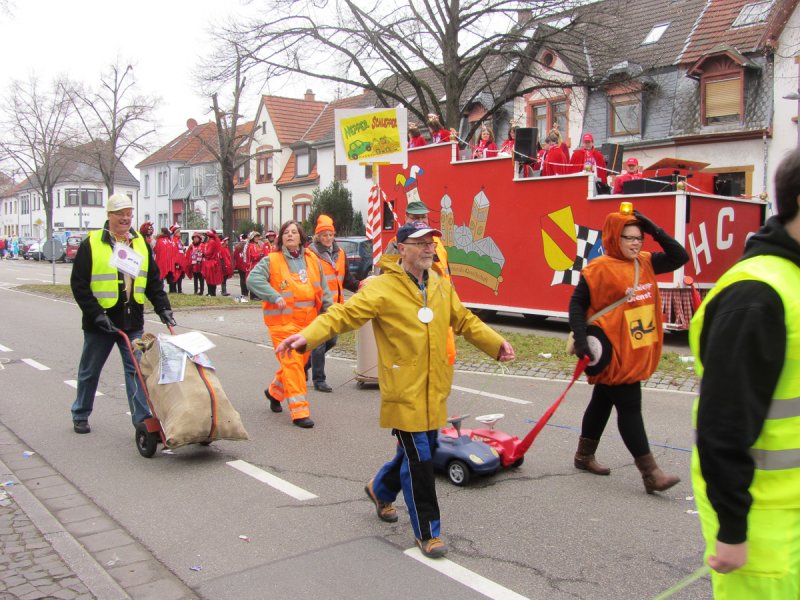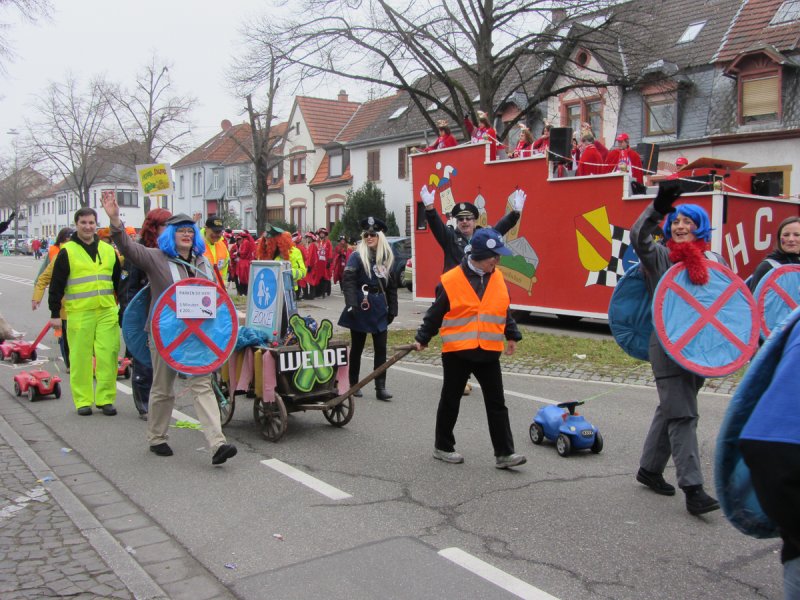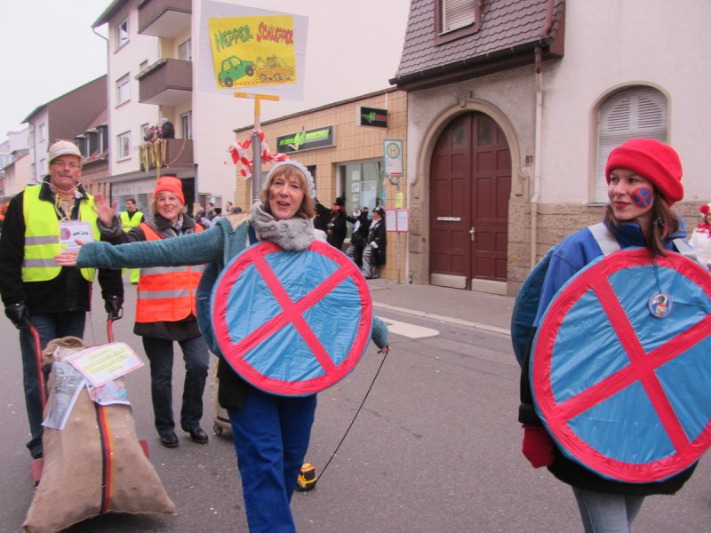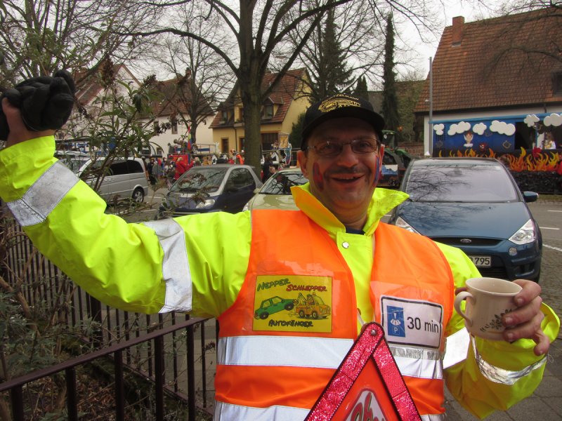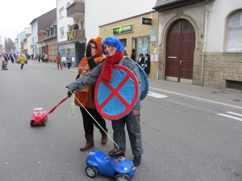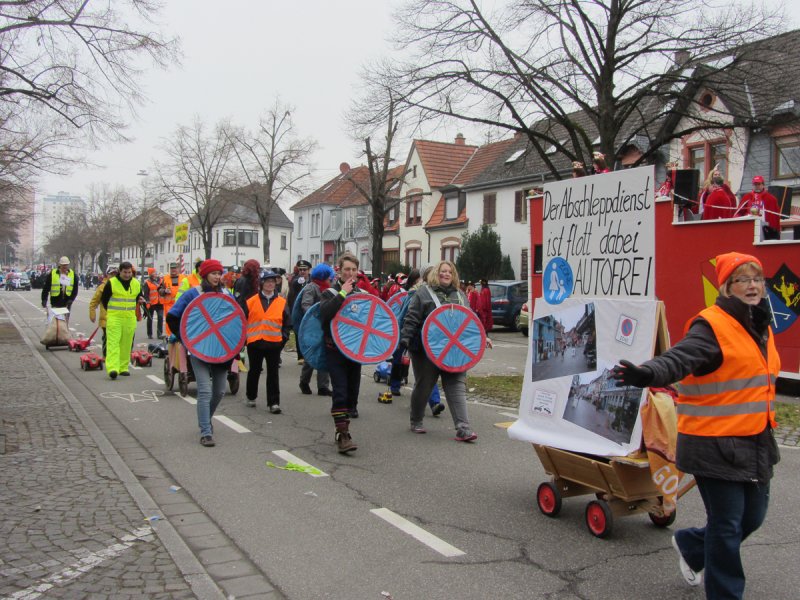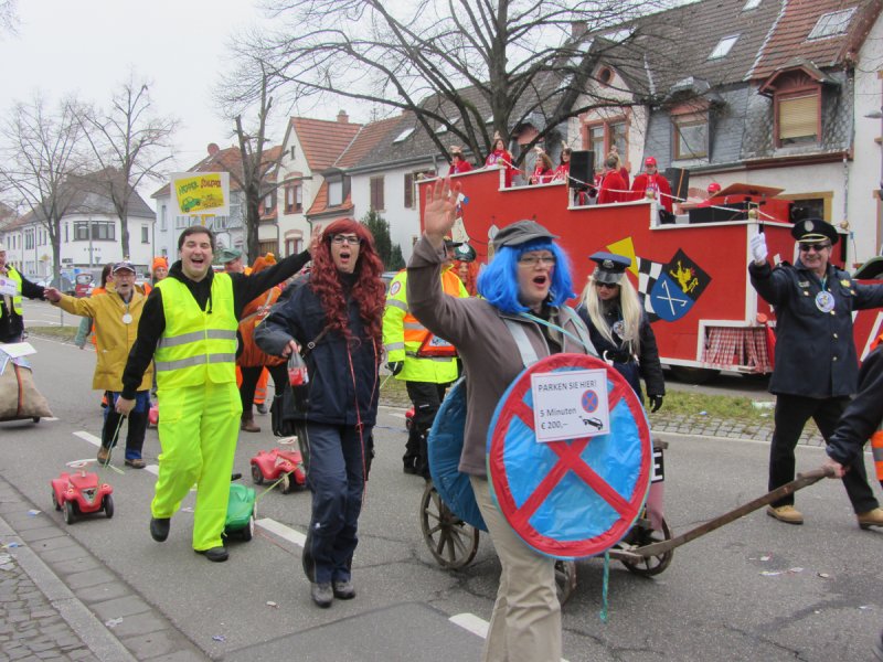 Und genauso bunt wie die vielen tanzenden Schwetzinger waren auch die Fußgruppen und Wagen, die sich wieder tolle Mottos ausgedacht hatten. Das quasi einzige lokale Thema hat der Sängerbund gemeinsam mit dem Liederkranz gewählt. Die Narren um die Vorsitzenden Sabine Rebmann und Gerhard Rieger griffen die Probleme in der Mannheimer Straße auf, die immer wieder von Autos zugeparkt wird. Und so stand groß und breit auf dem Plakat: „Der Abschleppdienst ist flott dabei, Fußgängerzone: AUTOFREI!“ – „Uns ist es wichtig, immer etwas Lokales zu thematisieren“, erklärte Gerhard Rieger, Präsident des Liederkranzes. „Einen richtigen Skandal gab es ja im letzten Jahr nicht“, sagte er mit einem Augenzwinkern. Aber mit der Parkproblematik haben die zwei Vereine schon ein besonderes Ärgernis für viele Anwohner aufgegriffen, das immer wieder für Gesprächsstoff in der Spargelstadt sorgt.