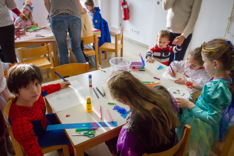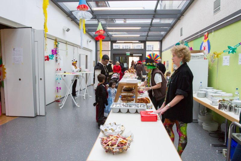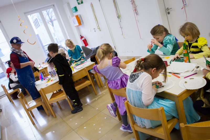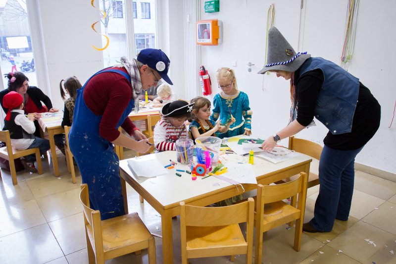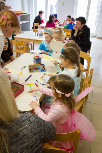Nach dieser willkommenen Stärkung zogen sich einige der inzwischen etwas karnevalsmüde gewordenen Kinder zu einem kleinen Ruhepäuschen in die kreative Fastnachts- Mal- und Bastelecke zurück, wo ihnen Jutta, Ute und Christina vom Sängerbund gute Tipps gaben, wie bunte Masken, Indianerschmuck und furchterregende Papierschlangen gebastelt werden.